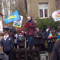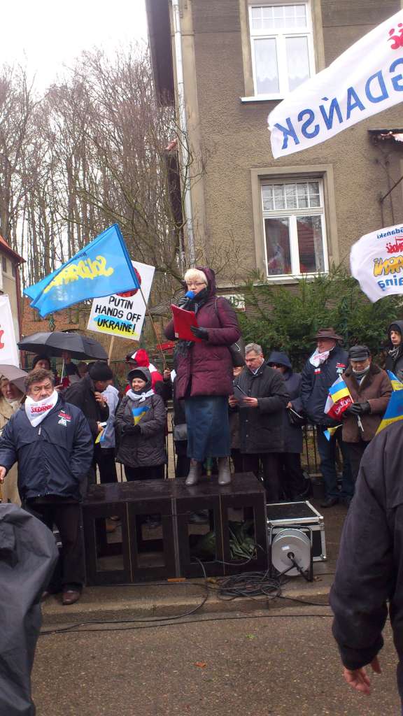 "Ukraina bez Putina", "Solidarność z Ukrainą" skandowaliśmy przed rosyjskim konsulatem otoczonym kordonem policji. Hania Minkiewicz wyrażając w naszym imieniu wsparcie dla Ukrainy użyła poezji ukraińskiego poety Tarasa Szewczenki oraz pięknie przeczytała wiersz Mickiewicza ,,Do przyjaciół Moskali'', w którym autor zwraca się do przyjaciół więzionych gdzieś w rosyjskich więzieniach.
