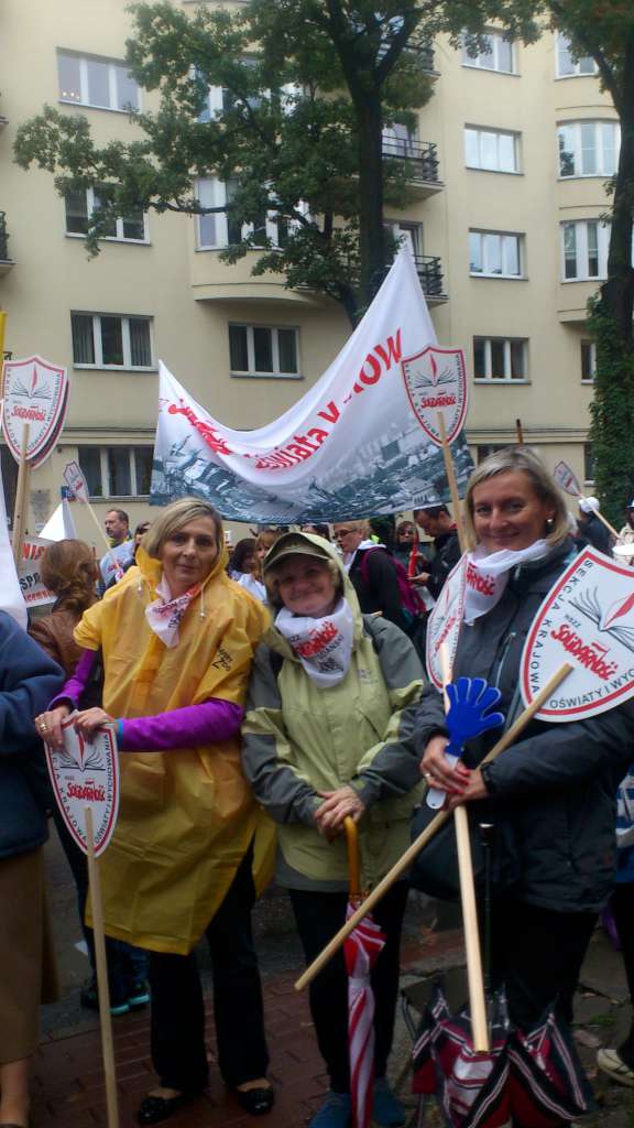 Mimo deszczu, bez przeszkód i w dobrych nastrojach dotarliśmy przed budynek Ministerstwa Edukacji Narodowej. Przywieźliśmy ze sobą dla protestujących nauczycieli powiększone do dużych rozmiarów tarcze szkolne z napisem Sekcja Krajowa Oświaty. Dzięki nim z daleka byliśmy rozpoznawalni jako związkowcy ,,Solidarności'' oświatowej. W pikiecie nie wzięli udziału nauczyciele z ZNP, które odmówiło wspólnego udziału w proteście.