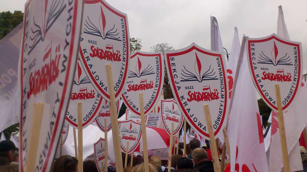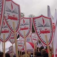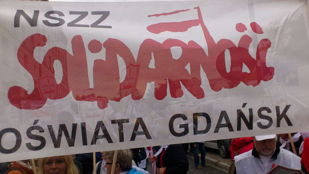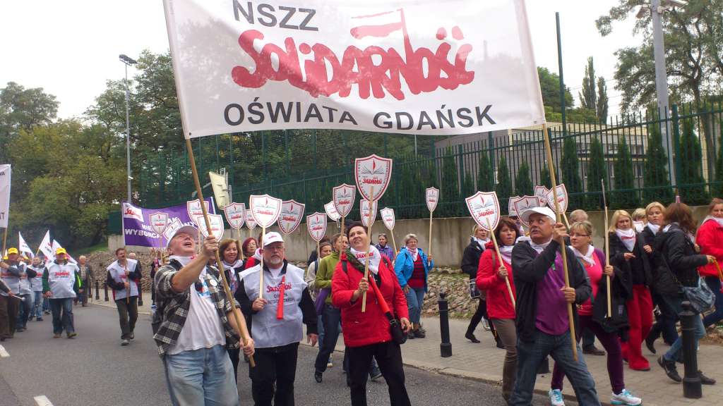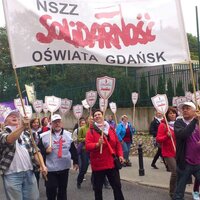 Oświata nie tylko z Gdańska wyróżniała się niesionymi licznie biało czerwonymi tarczami z napisem Sekcja Krajowa Oświaty i Wychowania.
