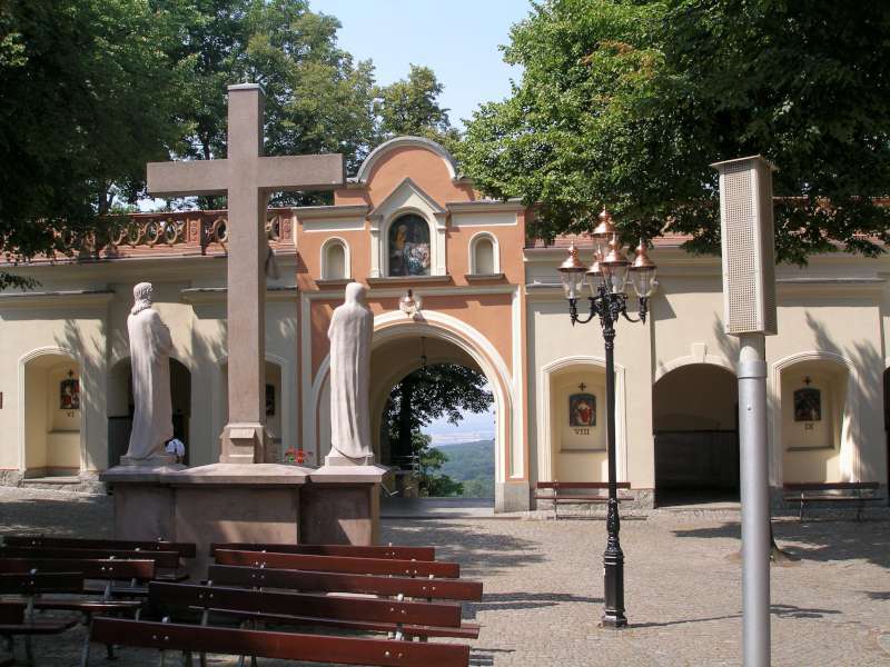Póżniej droga powiodła nas na szczyt wygasłego wulkanu - do sanktuarium Świętej Anny Samotrzeciej (uwiecznionej prawdopodobnie przez ludowego artystę w drewnianej figurce Św. Anny trzymającej na rękach małą Marię i dzieciątko Jezus. Tu swoje kroki powinny kierować wszystkie babcie, wszak Św. Anna była babcią Jezusa. Na Górę Św. Anny wiedzie szosa obsadzona drzewami czereśniowymi - niesamowity widok, podobnie jak niezwykła panorama śląskiej ziemi