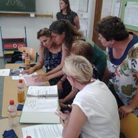 Wizytę w szkole podstawowej również zdominował temat imigrantów. Gdańską KM reprezentowały Hanna Kowalewska-Minkiewicz, Ewa Kuczyńska i Bożena Mazur. Poznaliśmy nauczycielkę wyznaczoną do nauczenia młodych imigrantów języka niemieckiego, jej metody, formy pracy i materiały dydaktyczne. Grupa liczy obecnie 25 uczniów w wieku od 6 do 17 lat, pochodzą z rożnych krajów europejskich i azjatyckich. Już dziś wiadomo, że nie wszyscy będą w stanie rozpocząć naukę w masowej szkole. Rząd niemiecki wyłożył wielkie środki na edukację imigrantów, jest to eksperyment w skali kraju.
